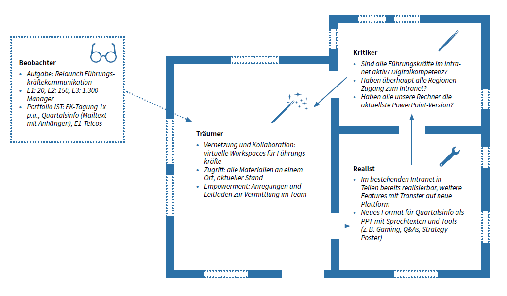 Wie kommen wir zu einer neuartigen und gleichzeitig machbaren Lösung? Dies ist die Leitfrage hinter der Disney-Methode. Bei diesem Tool schlüpft man – wie Walt Disney und sein Team – in verschiedene Rollen: Beobachter, Träumer, Realist, Kritiker. Jede Rolle wird nacheinander von der Gruppe eingenommen, um die Ausgangslage zu definieren, ideale Visionen zu skizzieren und diese schließlich auf ihre Umsetzbarkeit und Schwachstellen zu prüfen. Dieser Zyklus wird ggf. mehrfach durchlaufen und von einer Person moderiert.