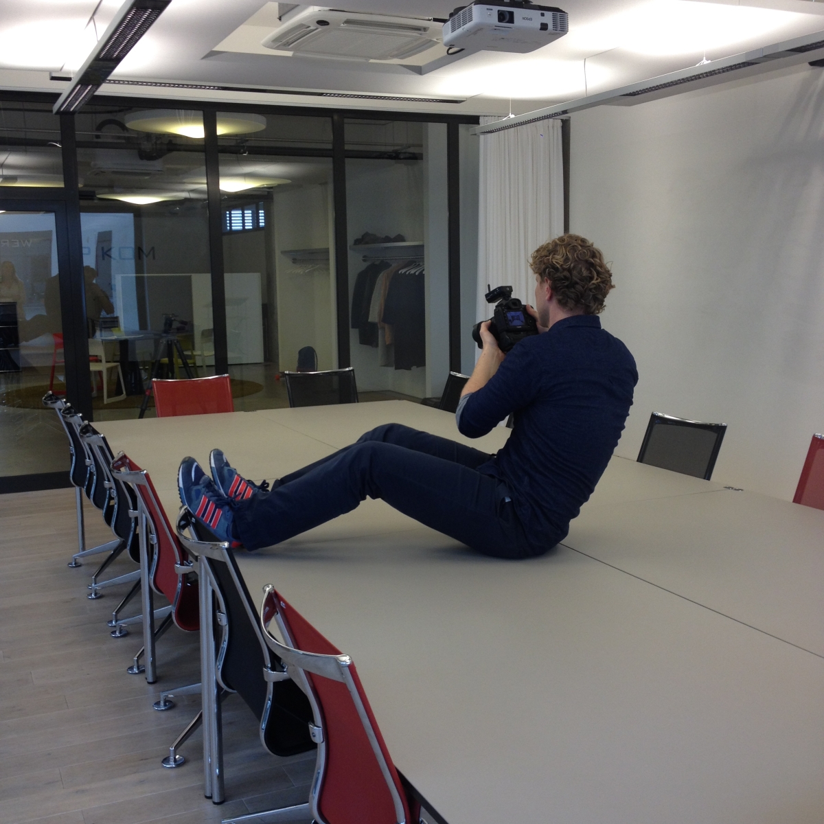 Während sich die JP│KOM Models um ihr Outfit kümmern, ist Fotograf Falco Peters mit ganzem Körpereinsatz bei der Vorbereitung.