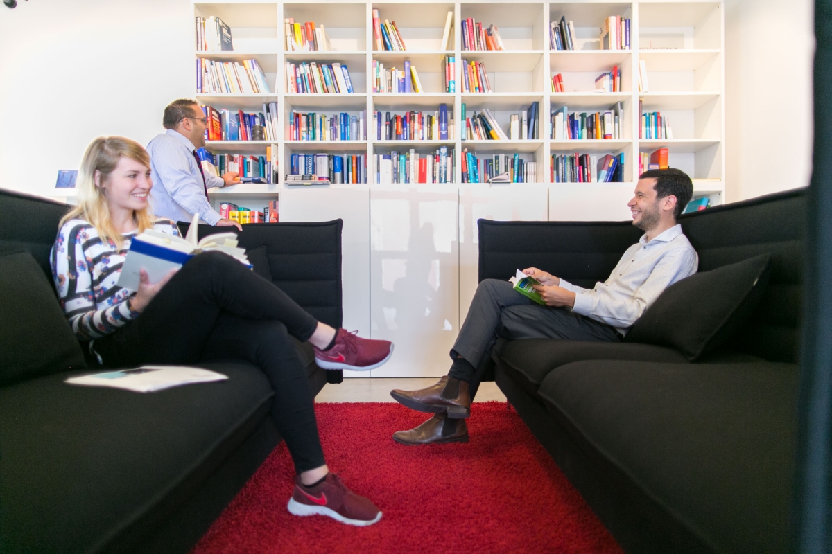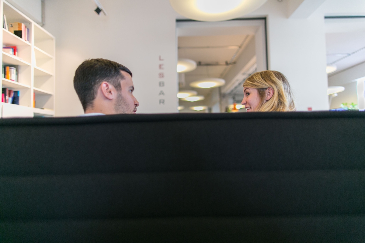 Attila Söder und Sarah Weber beratend in der „Lesbar“. Was der Gesichtsausdruck der beiden bedeutet, wird wohl ewig hinter der schwarzen Rückenlehne verborgen bleiben.