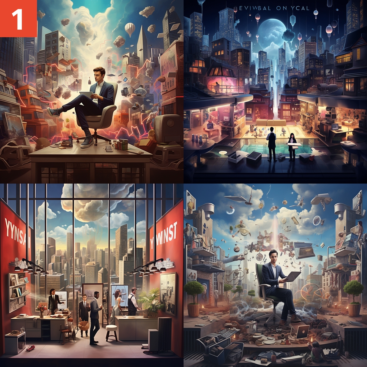 Prompt: Wir starten mit dem Prompt „keyvisual, Own your business --v 5.2." Ergebnis 1: Vier Bilder aus der Bürowelt in Fantasy-Gestaltung. Der Inhalt ist nicht getroffen.
