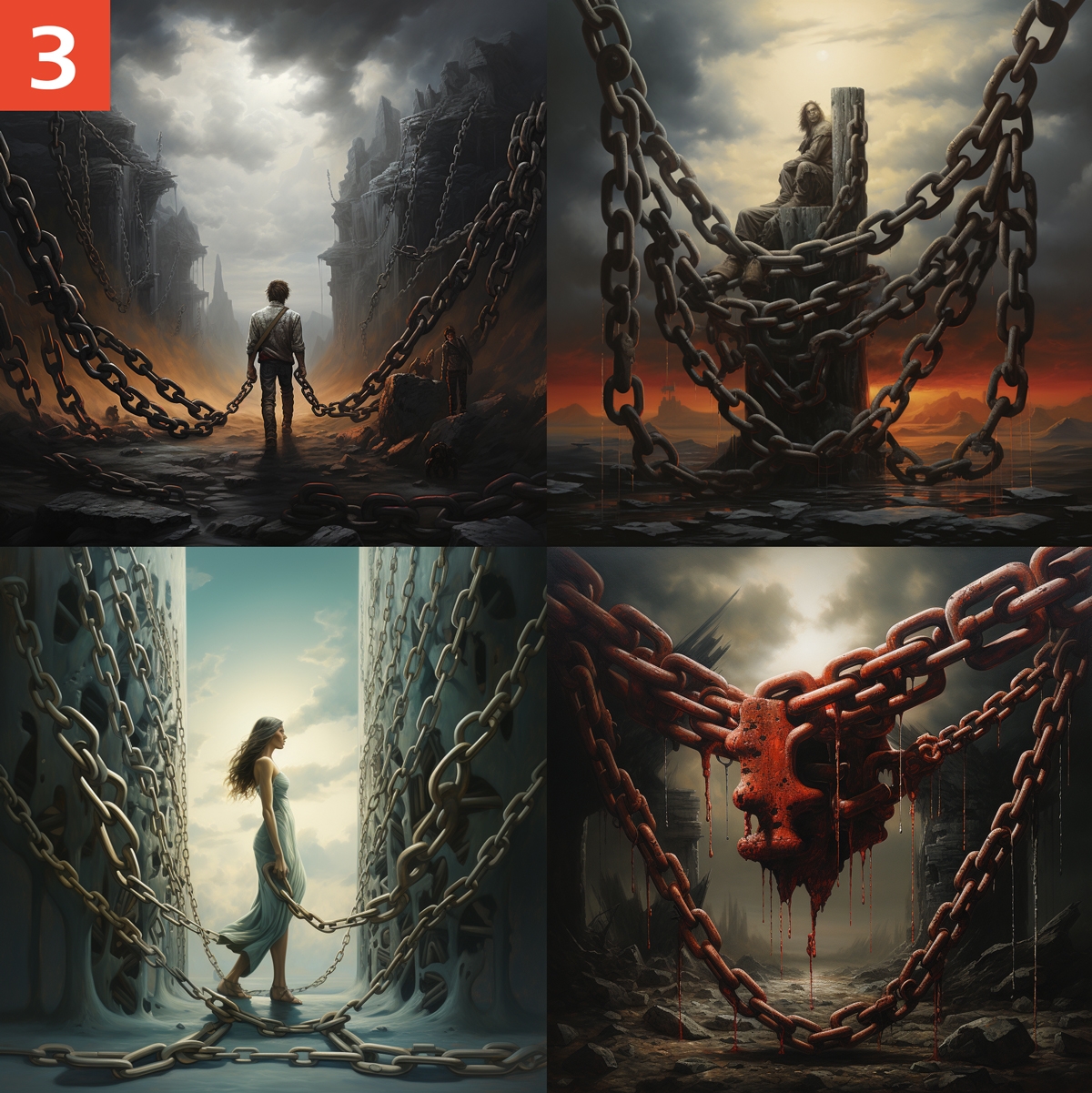 Wir machen mit einer Eventidee (Kettenreaktion) weiter. Prompt: „chain reaction --v 5.2". Ergebnis 3: Es werden Menschen in Ketten gezeigt. Die Bildidee wird sehr wörtlich umgesetzt - nicht sehr motivierend.