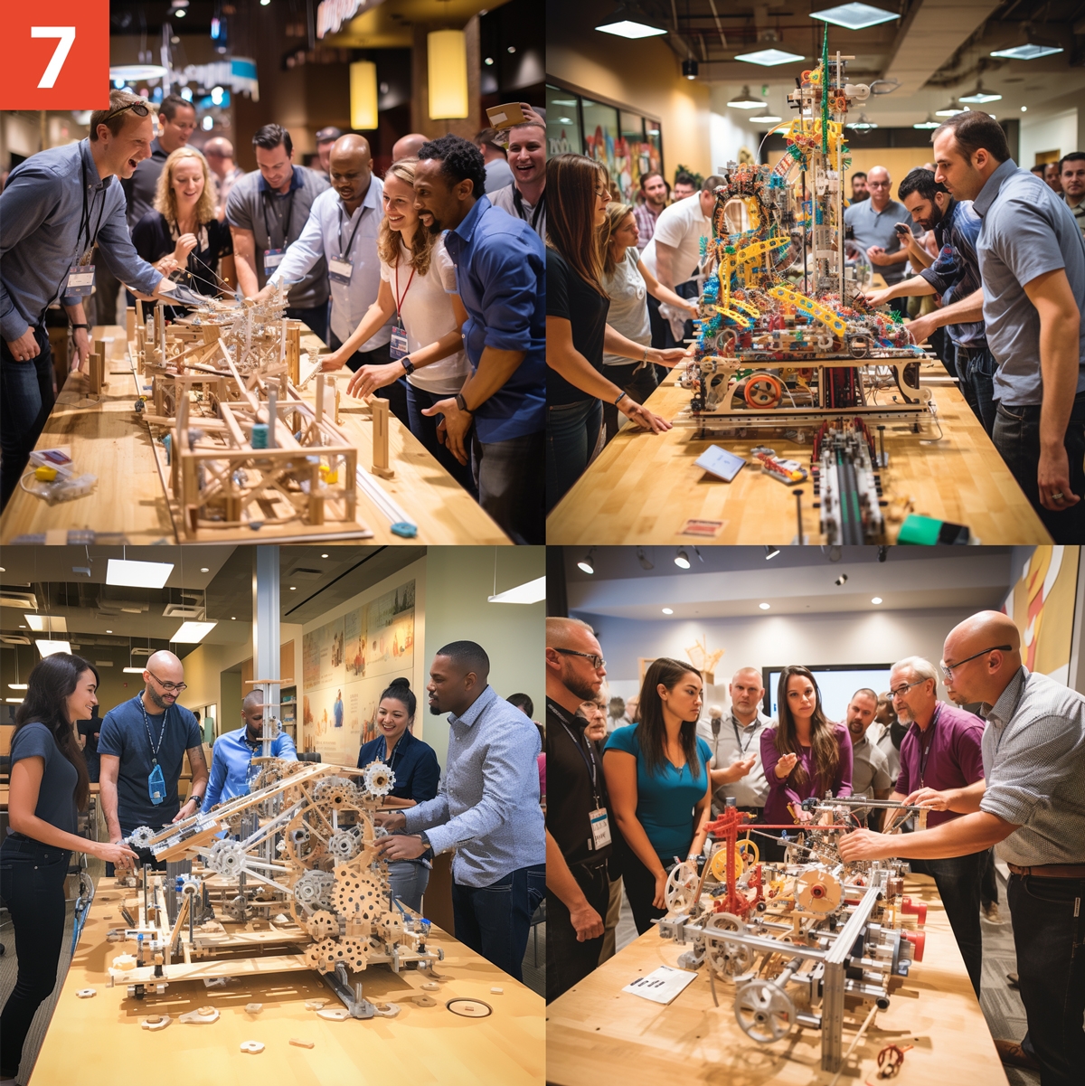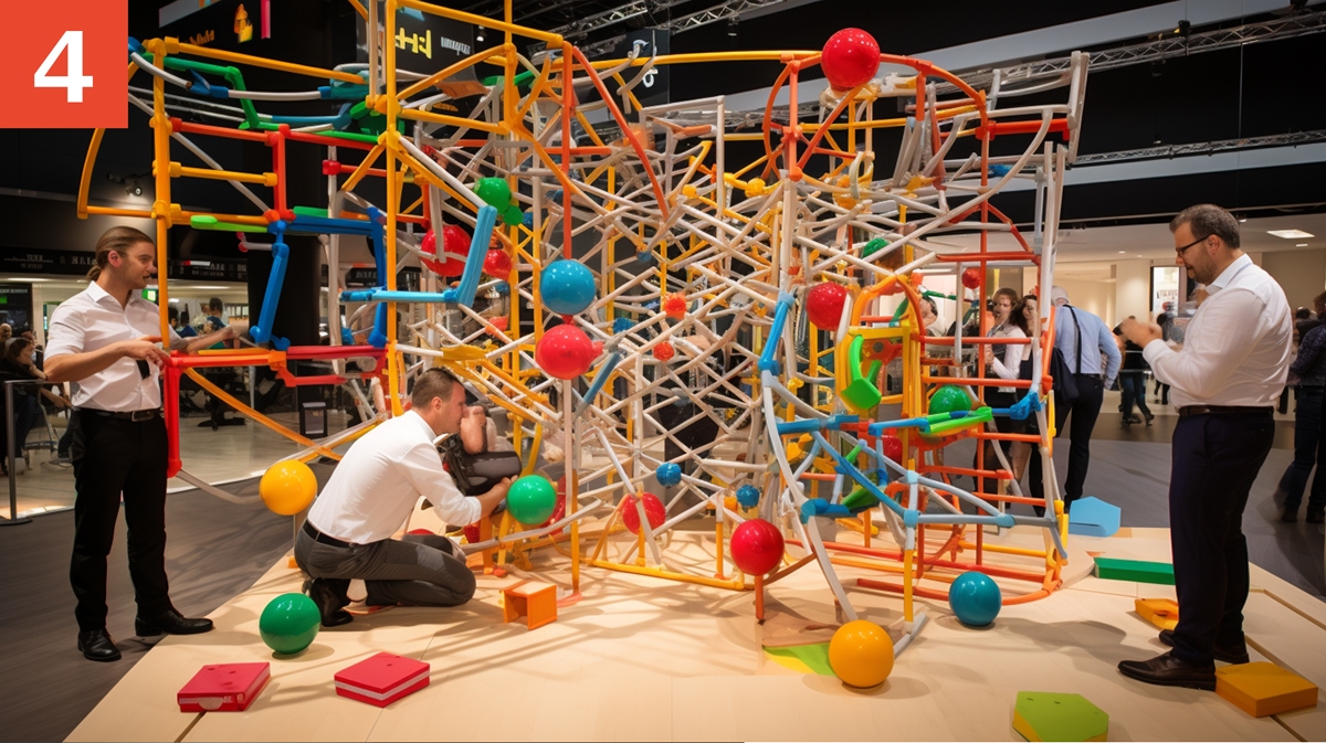 Näher kommen wir dem Ergebnis, als wir im Internet nach dem Erfinder von Kettenreaktionsmaschinen recherchieren (Rube-Goldberg-Maschine). Mit diesem Zusatz schreiben wir den Prompt: „team building exercise where a diverse group of people work together building rube Goldberg type machines, similar to the show Chain Reaction. The venue is large conference room with branding celebrating technology --v 5.2". Ergebnis 7: Rube-Goldberg-Machine mit Menschen. Das hatten wir uns aber bereits selbst ausgedacht und versucht einzubriefen – kein kreativer Mehrwert durch die KI erkennbar.