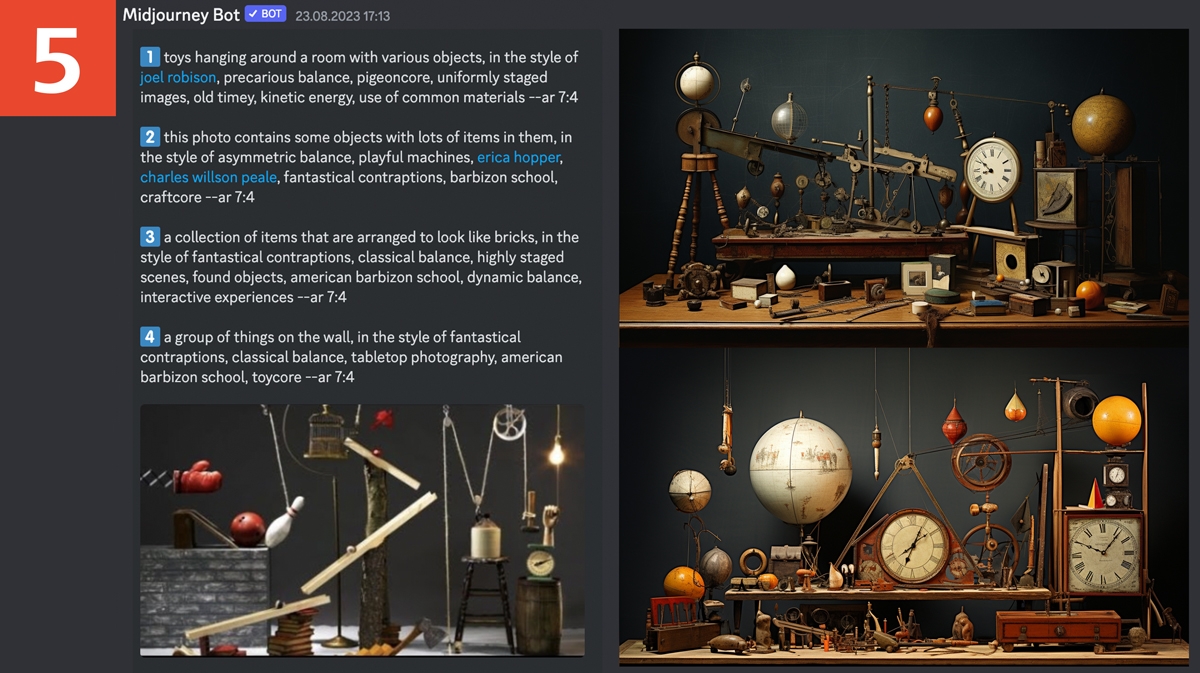Um zu verstehen, welchen Text Midjourney für eine Kettenreaktion braucht, beschreiten wir den umgekehrten Weg und laden ein Bild von einer Kettenreaktion in Midjourney hoch und lassen daraus einen Prompt generieren. Ergebnis 5: Midjourney gestaltet immer noch am Thema vorbei, Zeitmotive stehen im Vordergrund, nur das Motiv könnte einen Ansatzpunkt bieten.