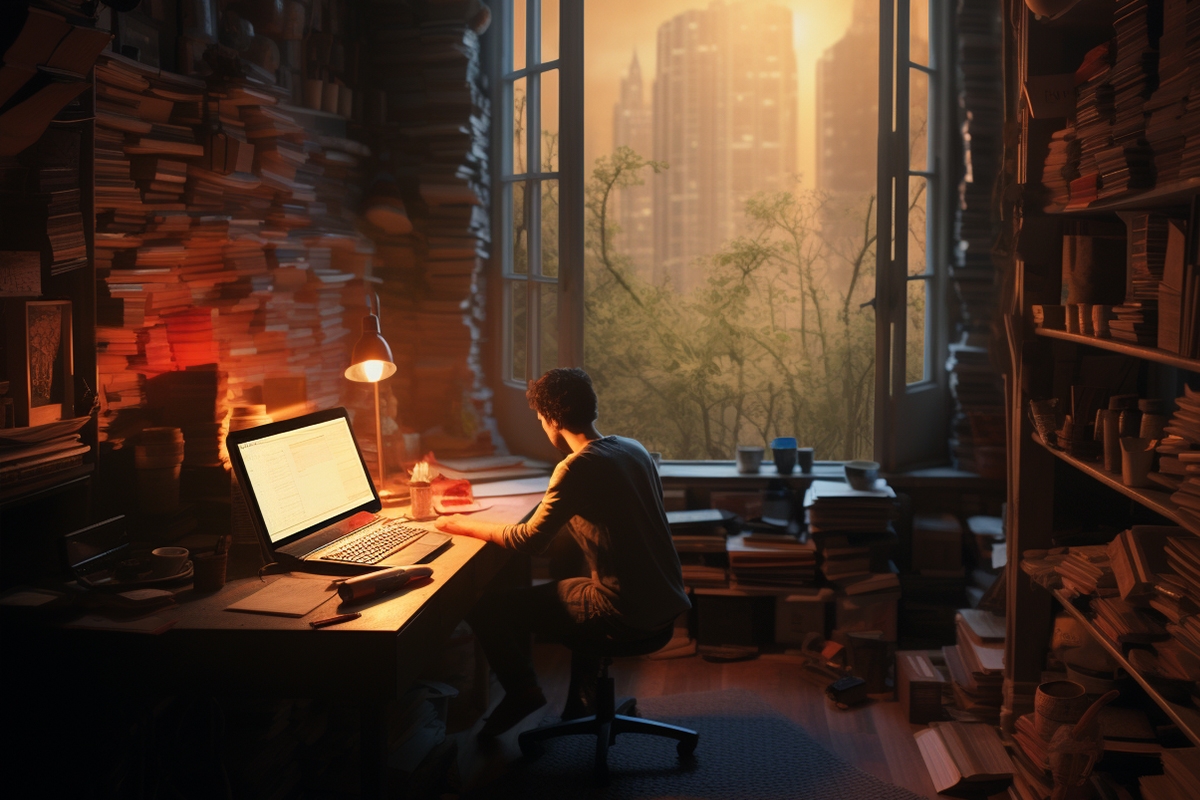 Ergebnis: Wir erhalten eine interessante Bildidee. Die leicht mystifizierende Verfremdung der Redaktionsarbeit mit viel Informationsmaterial/Büchern in einer großen Stadt.