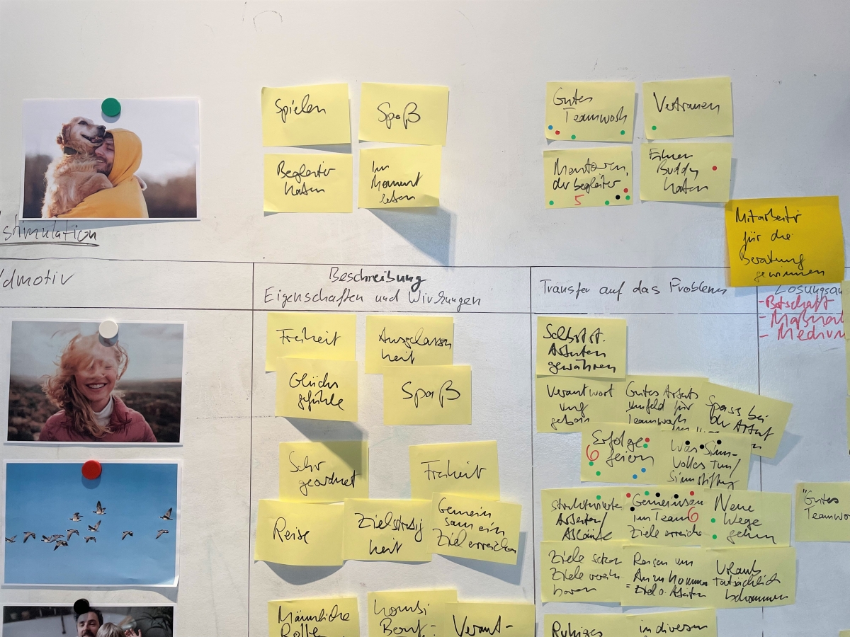 Hier werden Bildmotive vorgelegt, die mit dem eigentlichen Problem wenig zu tun haben: Das können Menschen sein, Naturszenen oder auch Gegenstände. Das Ziel ist es, Denkmuster aufzubrechen, die Aufgabe in einem neuen Kontext zu betrachten und durch Assoziationen neue Ideen zu entwickeln. Man entfernt sich zunächst vom eigentlichen Problem und bildet dann anhand von Bildern Analogien. „Manchmal muss man knapp daneben zielen, um zu treffen”, erklärt Jörg Pfannenberg. Wir haben viele tolle Ideen auf den Tisch gebracht!