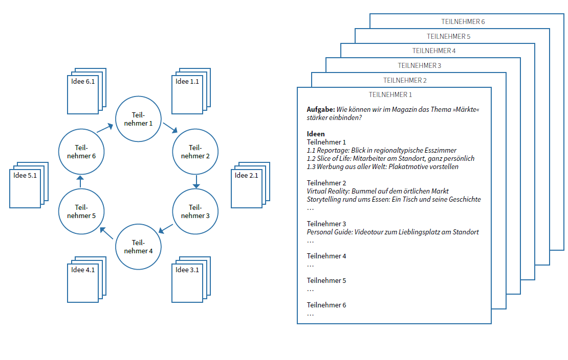 Diese Methode eignet sich bestens dazu, schnell viele Ideen zu generieren. Der Moderator/die Moderatorin erläutert die Fragestellung und schreibt sie für alle sichtbar an. Die Teilnehmer:innen bekommen ein Blatt und schreiben drei Ideen auf. Nach der vereinbarten Zeit wird das Blatt an die nächste Person in der Gruppe weitergegeben, die an die aufgeschriebenen Ideen anknüpft und sie weiterentwickelt. Wiederholen Sie diesen Prozess ca. fünf Mal und stimmen Sie hinterher in der Gruppe für die Favoriten ab. Voilà – ein Pool an Ideen!