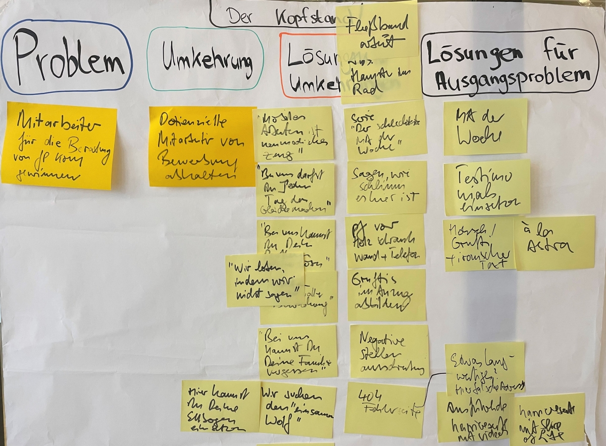Eine beliebte und humorvolle Technik für Workshops ist der Kopfstand. Was wünscht man sich nicht? Was soll auf keinen Fall geschehen? Da es den meisten Menschen leichter fällt, negative Aspekte zu nennen, produziert die Kopfstandmethode für die umgekehrte Herausforderung schnell viele Ideen. Entscheidend ist, die umgekehrte Aufgabe so zu formulieren, dass ein starkes Bild entsteht. Das heißt: Negativierung zulassen, starke Verben nutzen, extreme Szenarien ausmalen. Probieren Sie es mal!