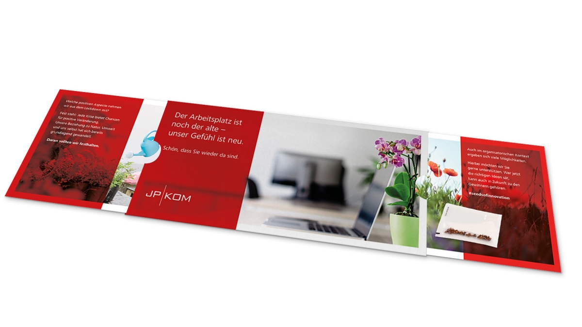 Und wie lässt sich das Thema im Marketing nutzen? JP KOM heißt seine Kunden mit einer eigenen Back to Office-Aktion willkommen zurück im Büro: „Schön, dass Sie wieder da sind“, sagt die Karte, die alle Kunden in der Woche ihrer Rückkehr erhalten. Das Bildmotiv und ein kleines Päckchen mit Samen sollen es ermöglichen, ein bisschen von den positiven Erfahrungen im Home-Office mit zurück ins Büro zu nehmen – und sei es nur die Pflege und das Gießen der Pflanzen auf der heimischen Fensterbank.