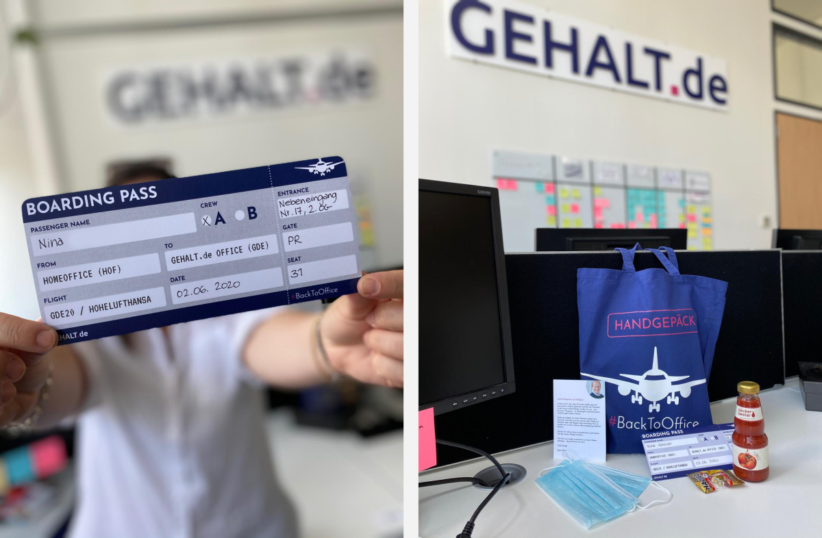 Onboarding bei Gehalt.de: Die Mitarbeiter bekamen „Flugtickets", auf denen ihr „Gate“ und „Sitzplatz“ vermerkt waren. In den „Gängen“ herrschten unterschiedliche Sicherheitsstufen.