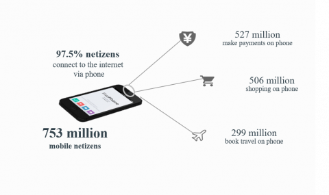 At the end of 2017, 772 million Chinese citizens had access to the Internet, making them the largest online population in the world. Out of these users, 97.5% were using their phones to connect to the Internet. China’s mobile netizens already make many of their purchases on their smartphones. As the following graphic shows, a high percentage of users use their phones to make payments (70%), do their shopping (67.2%) and book their travel (39.7%).