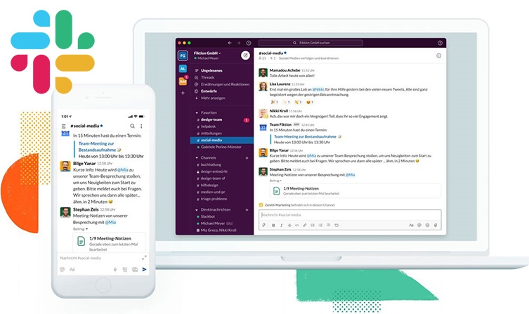 Den Klassiker der Kollaborationssoftware gibt es sowohl webbasiert als auch als Client für Desktop- und Mobilgeräte. Mit Slack kann über Direktnachrichten sowie in Gruppen und Kanälen gechattet werden. Slack bietet eine gut funktionierende gratis-Version für kleinere Teams – für den Zugriff auf mehr als die 10.000 letzten Nachrichten des Teams sowie Videokonferenzen kostet es 6,25 € pro Monat. Für das gemeinsame Arbeiten an Dokumenten muss ein separates, zusätzliches Tool verwendet werden, etwa Google Drive oder Dropbox.