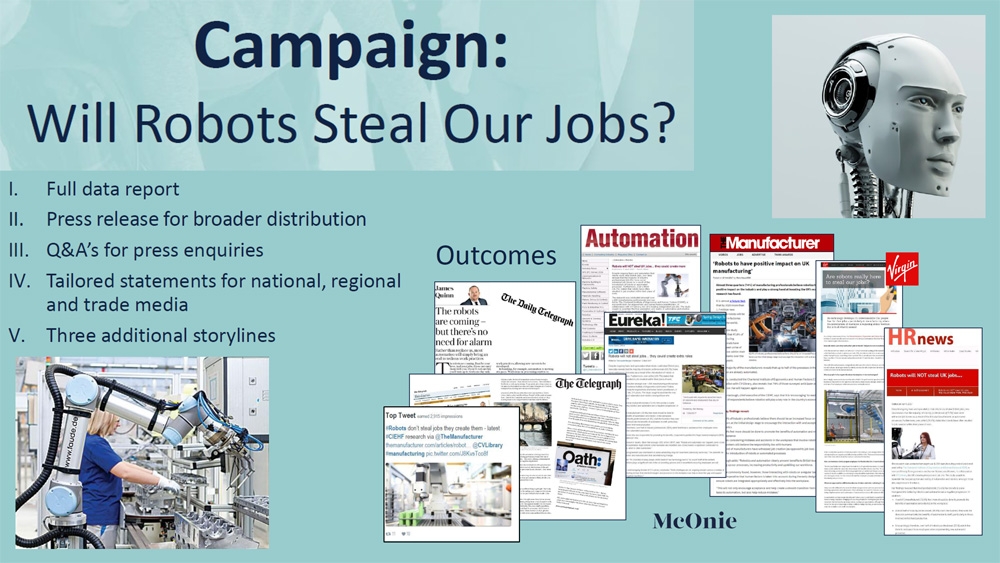 Strategie & Maßnahmen. Es musste ein Thema gefunden werden, das die Menschen bewegt: „Will robots steal our jobs?“. Die Grundlage zur Beantwortung dieser Frage bildete eine Onlinebefragung von über 1.000 Führungskräften aus dem verarbeitenden Gewerbe. Auf Basis der Ergebnisse entstand die Story für die Kampagne. Die Ergebnisse wurden als Data Report aufbereitet. Dazu wurden Pressemeldungen, Q&As und Statements für verschiedene Medientypen verfasst. Die Vertreter des CIEHF wurden für den Dialog mit Herstellern und den Medien trainiert.