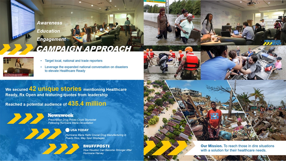 Ergebnis. 42 Berichte über Healthcare Ready (u.a. in Newsweek, USA Today, Huffington Post) mit einer Reichweite von 435 Millionen Menschen. Healthcare Ready erhielt durch die Berichterstattung mehr Spendengelder als zuvor und konnte sich auch nach der Hurrikansaison als Experte und Meinungsführer in den Medien positionieren.