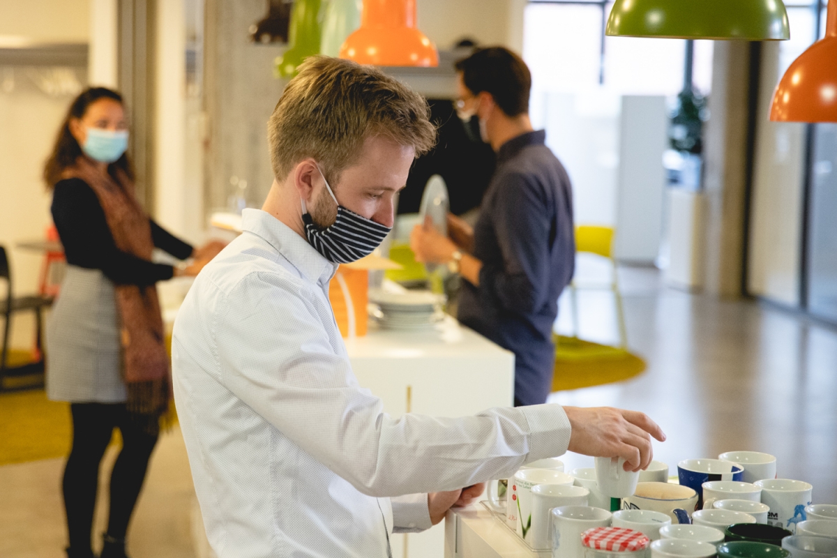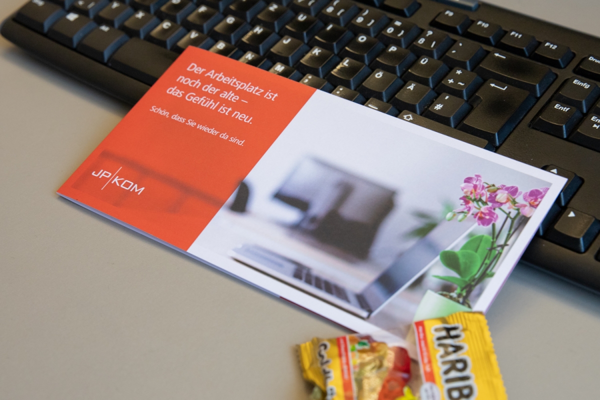 Nur zwei Mitarbeiter pro Schreibtischinsel, Mund-Nasen-Schutz auf den Gängen: Optisch haben sich die Büros in Düsseldorf und Frankfurt zwar nicht verändert, aber die Atmosphäre ist neu: „Die Gefühle der Kolleginnen und Kollegen sind gemischt“, sagt JP│KOM Geschäftsführer Jörg Pfannenberg. „Viele haben sich ans Home-Office gewöhnt. Andererseits freuen sie sich auf das Wiedersehen mit Kollegen und Arbeiten auf Zuruf. Der Wunsch nach ist da, einige haben womöglich Angst sich anzustecken. Jetzt ist es wichtig, als Arbeitgeber zu motivieren und Orientierung zu bieten.“ Wie die Kunden erhalten alle Mitarbeiter*innen die JP│KOM Begrüßungskarte.