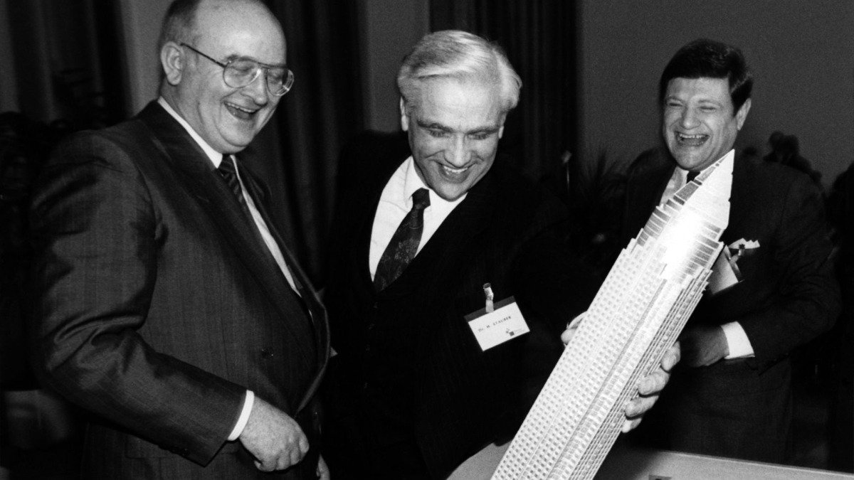 Die Freude über den Messeturm steht ihnen ins Gesicht geschrieben: Oberbürgermeister Wolfram Brück, der Chef der Frankfurter Messe, Horstmar Stauber, und Investor Jerry Speyer. © Kai-Uwe Wärner, 1988
