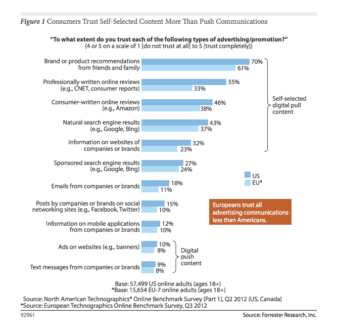 Forrester hat kürzlich untersucht, welchen Werbeformen Konsumenten vertrauen. Die Ergebnisse stützen unsere Haltung: Auf dem ersten Rang bleiben Empfehlungen von Freunden und Familienmitgliedern. Doch bereits danach folgen Bewertungen und Rezensionen auf Blogs und Online-Portalen.