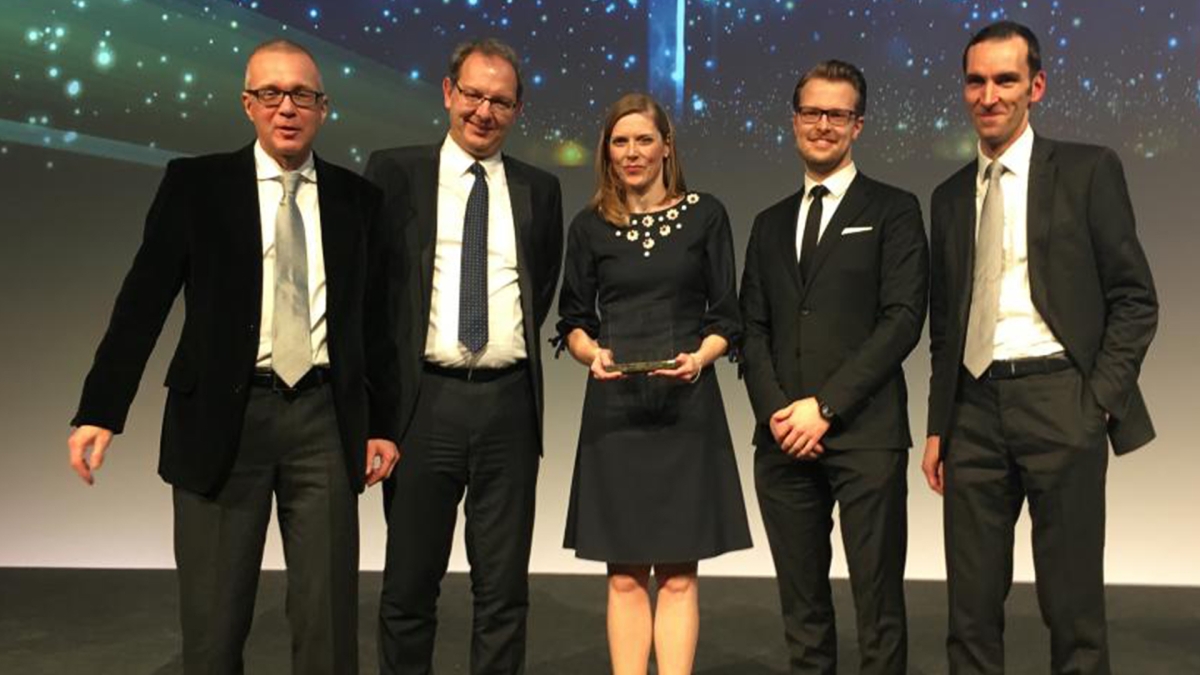 Glückliche Gewinner bei der Verleihung des Internationalen Deutschen PR-Preises am 22. Januar 2016 in Frankfurt (Markus Woehl, Kristine Adams, 2. und 3. v.l., Lars Rosumek, r., Voith; Jörg Pfannenberg, l., Martin Michel, 2. v.r., JP | KOM)