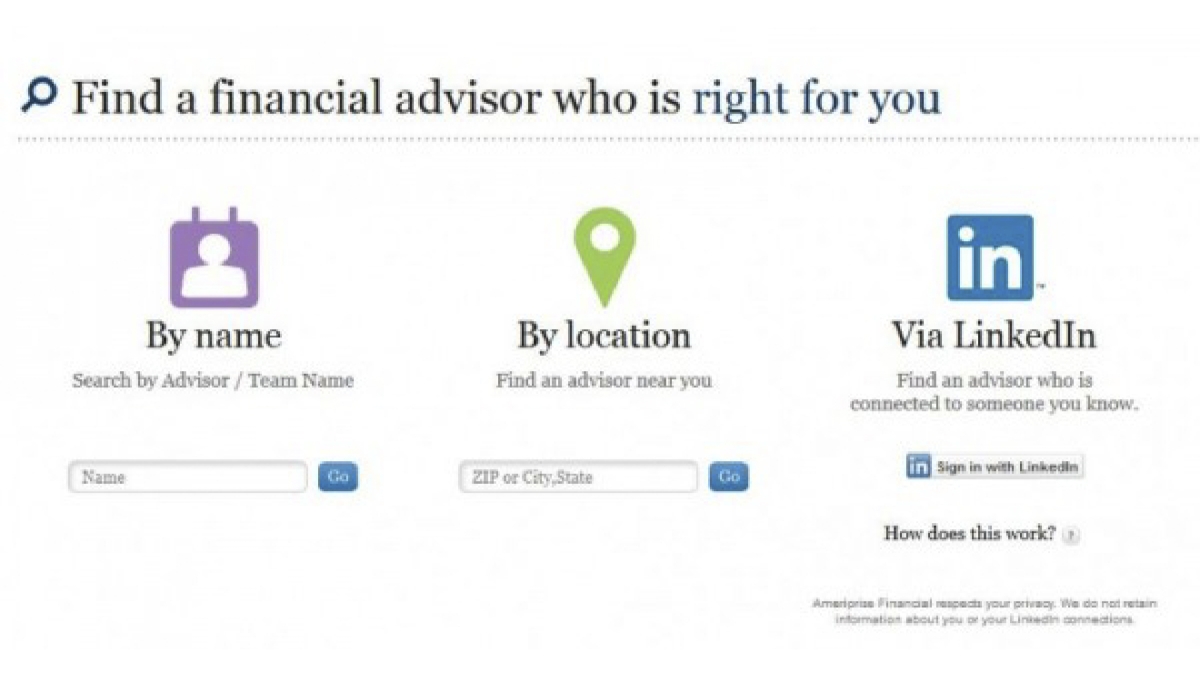 Der US-Finanzdienstleister AmeriPrise, der kürzlich in einem Ranking zu den Social Media Aktivitätenausgezeichnet wurde, bietet auf seiner Website drei Suchvarianten an, um einen Kundenberater zu finden. Wirklich interessant ist die letzte Variante: Die Suche nach einem Berater unter Kontakten eigener Kontakte auf LinkedIn.