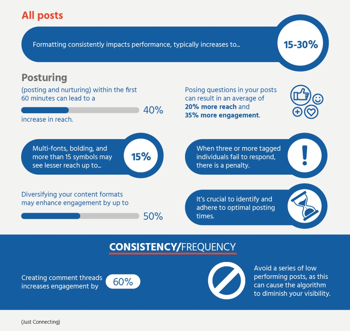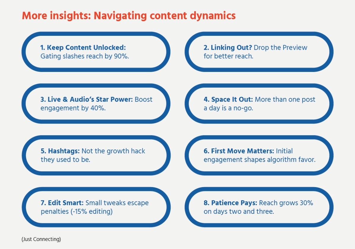 - Engage, don't post & ghost. Stick around to mingle after you have posted. Engaging with your post (commenting and replying) within the first hour significantly increases its reach, potentially by up to 40%.