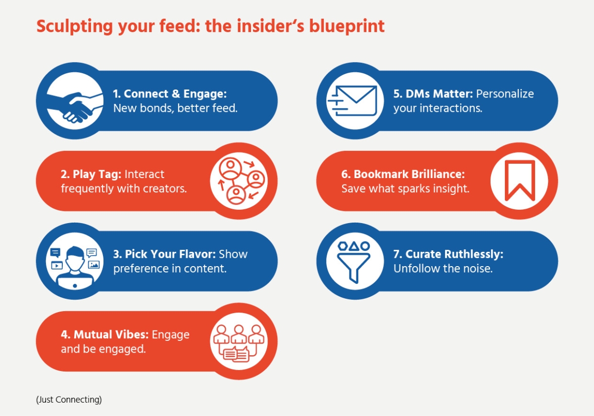 How to interact to get more attention? To sculpt your feed, connect with new people, interact with creators, show content preference, engage mutually and unfollow non-essential noise.