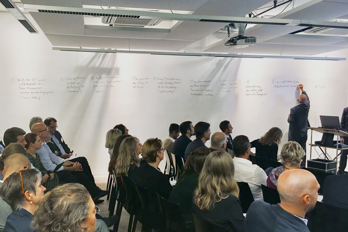 Die Thesen wurden teils kontrovers diskutiert und stießen auf großes Interesse beim Publikum – das zeigte sich nicht zuletzt an den Beiträgen auf der eigens installierten Twitterwall. Über die Frage, welche Rolle die Interne Kommunikation letztendlich bei der Digitalisierung spielen wird, diskutierten  die Teilnehmer auch beim anschließenden Get-Together in zahlreichen Gesprächen bei Wein und Fingerfood – auch hier gingen die Meinungen teils weit auseinander.