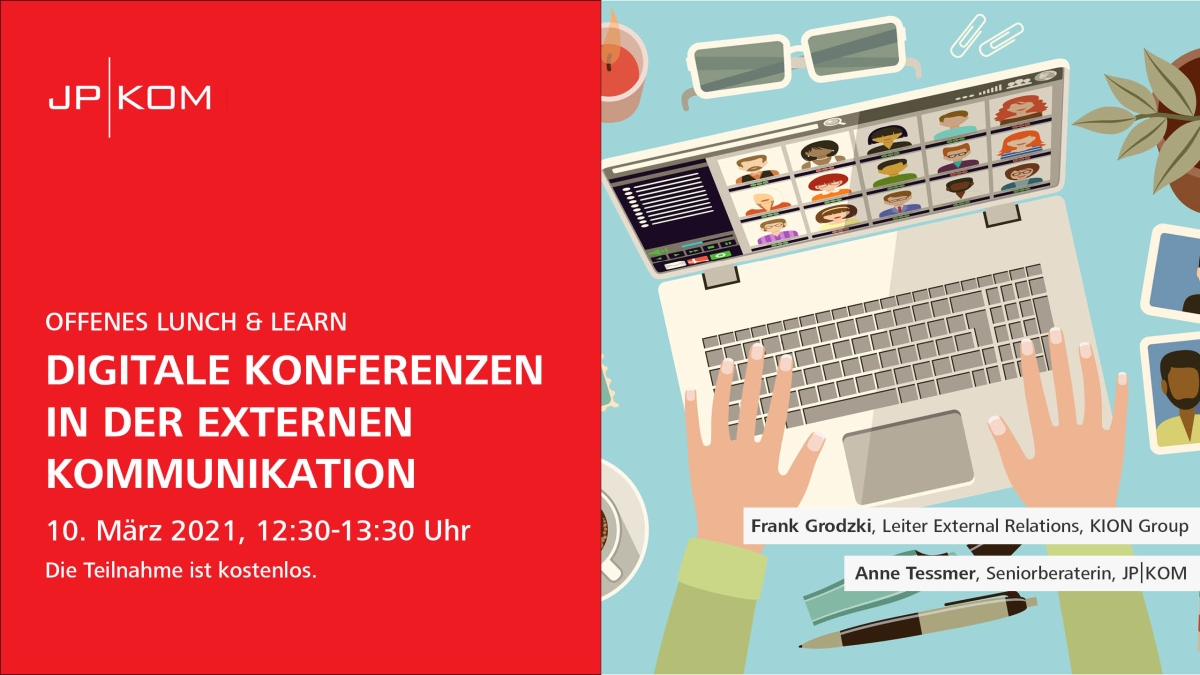 Wie setzen Sie digitale Veranstaltungen um? Was sind Ihre Fragen und Tipps? Das Lunch & Learn ist eine offene Veranstaltung von JP│KOM für Kommunikatoren.