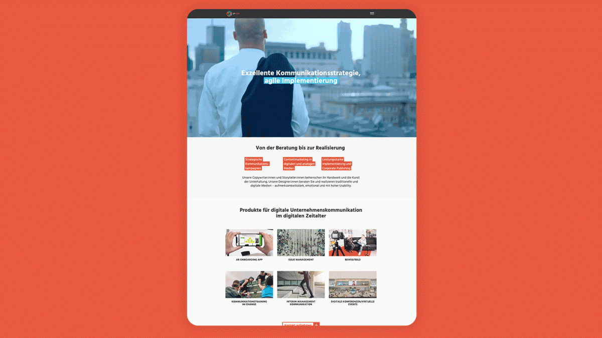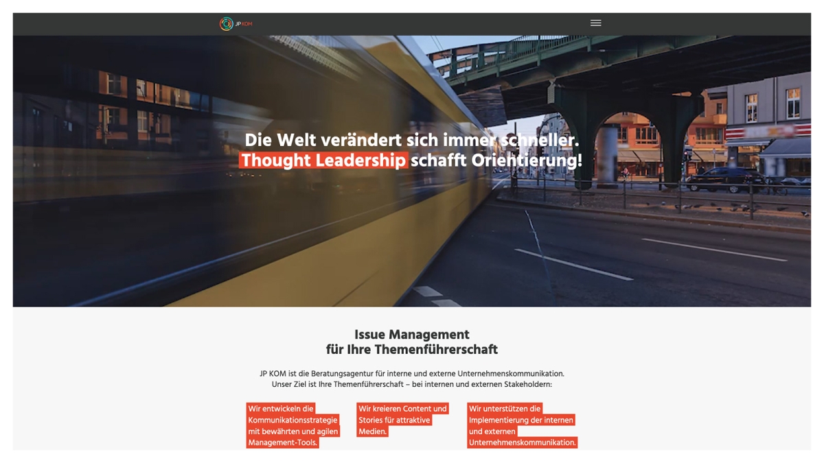 „Die Welt verändert sich immer schneller. Thought Leadership schafft Orientierung“: Der Intro-Film auf der neu gestalteten Website ist aufmerksamkeitstark und emotional, er macht die Herausforderungen an Kommunikation in Zeiten der neuen Unübersichtlichkeit deutlich. Es folgt das Leistungsversprechen von JP KOM: „Issue Management für Ihre Themenführerschaft“. Die neue Website zeigt emotionale, großflächige Visuals, die teilweise auch als Hintergründe in den farbigen Boxen erscheinen. Vier starke Farben, die aus dem Logo abgeleitet sind, stehen für die vier Themen der Website: Agentur, Leistungen, Wissen mit der JP KOM Toolbox und Karriere. Der Inhalt wurde stark reduziert und SEO optimiert. Kontaktformulare öffnen überall den Zugang zu JP KOM. Und natürlich gibt es die wesentlichen Seiten auch auf Englisch.