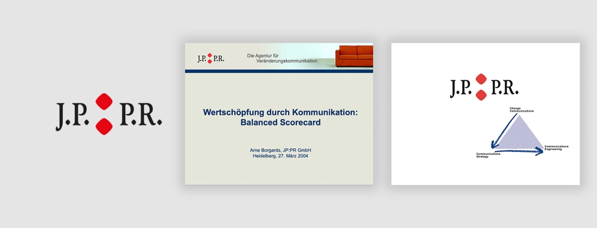 Das Logo von JP KOM war bisher in Grau und Rot (100/100) gehalten; einziges Element war ein schlichter roter Strich, anfangs ein roter Doppelpunkt. Maximal reduziert auch die Farbwelt: Schwarz, Weiß, Grau und Rot. Und natürlich jede Menge Weißraum, weil das so ordentlich aussieht. Ein CD im Geiste des kühlen Hildmann Simon Rempen Schmitz-Designs der Düsseldorfer 80er und 90er Jahre, das Bauhaus und die Ulmer Hochschule für Gestaltung ließen grüßen. Cool vielleicht, aber nicht wirklich emotional und motivierend. Auch ein Redesign mit Schwarz-Weiß-Fotos der Mitarbeitenden und der Agentur-Innenräume vor einigen Jahren hat die Sache nicht besser gemacht, sondern den Auftritt von JP KOM eher in eine nach innen gewandte Intellektualität getrieben.
