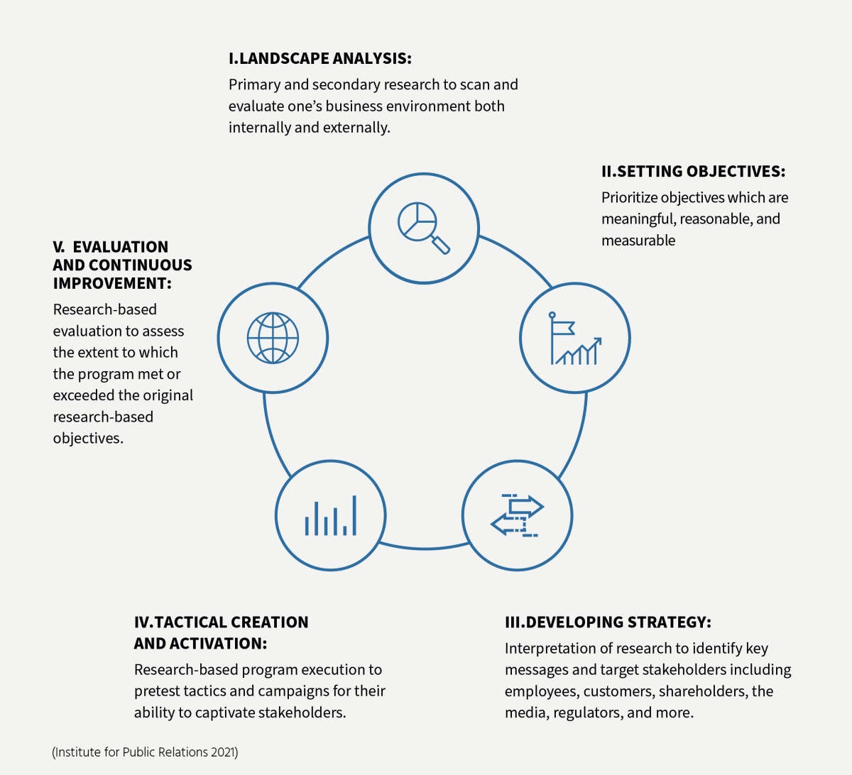 In its Guide to Research, Analysis and Evaluation (2021) the Institute for Public Relations (IPR) defines the strategy process with a focus on measurement, with five components: Landscape analysis, Setting objectives, Tactical Creation and activation, and Evaluation and continuous improvement. The main difference to the four step-model of project management lies in step II: Setting objectives which in this model is not part of the Strategy but a step of its own.
