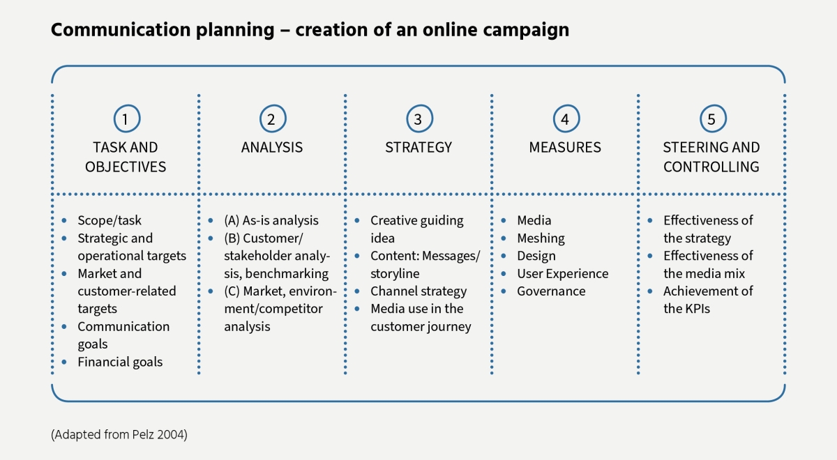 Pelz's (2004) model aims to develop online campaigns. It also follows the four-step Analysis - Strategy - Measures - Controlling, here supplemented by the first part Task. In line with the scope of the online campaign, the process steps for strategy development in the age of integrated and digital communication include content such as Customer/stakeholder analysis and benchmarking, Creative guiding idea, Content: Messages/storyline, Channel strategy, Media usage in the customer journey, Meshing, Design, User experience, Governance and Effectiveness of the media mix. The model uses familiar tools from management and marketing in the process steps. Under Task and Objectives it establishes the link between operational and communication objectives. However, in a departure from the typical sequence in project management, the objectives are dealt with together with the task – and thus before the analysis of the situation. But objectives can only be cleanly defined on the basis of the actual state.