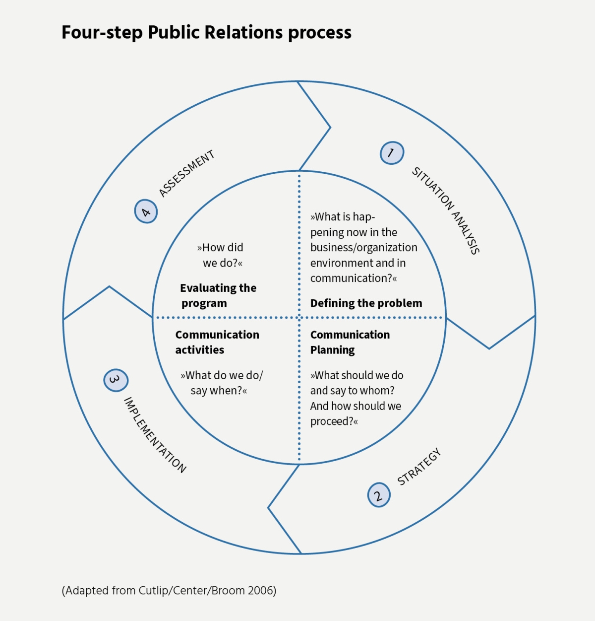 Cutlip/Center/Broom's (2006) four-step model of the Public Relations process provides an overview of the tasks and guiding questions in the stages for developing communication strategies.