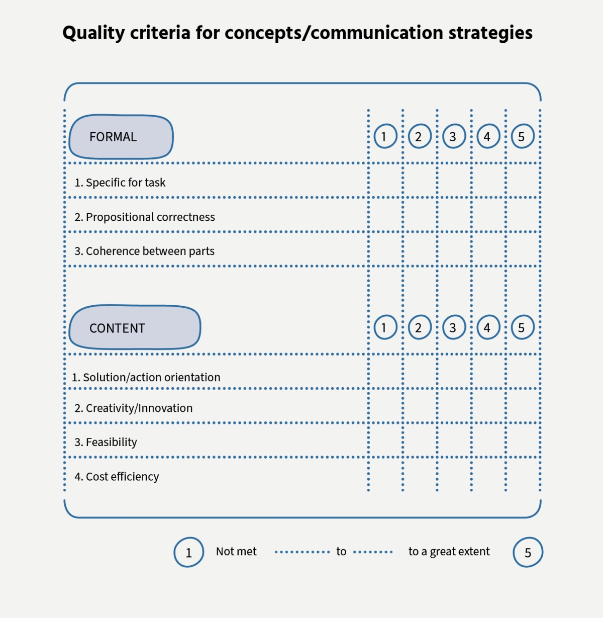 The lists of criteria for awards can provide initial. In the following, we make a proposal for quality criteria for communication strategies, consisting of three formal and four content criteria.