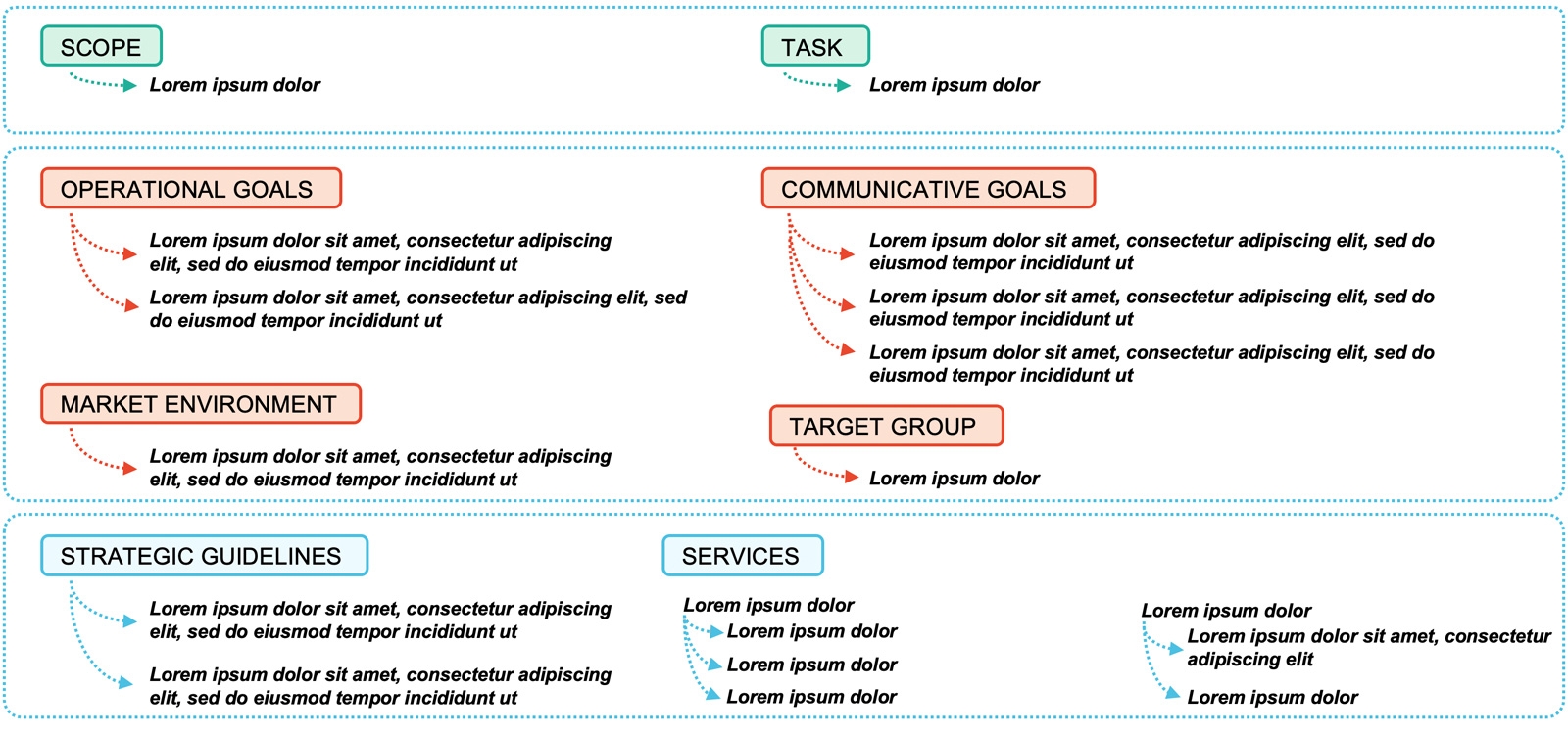 Topics and quality of briefings vary greatly in practice. Ideally, the briefing contains information about the scope and task of the communications strategy, about the operational or strategic background (for example, in marketing/sales or in mergers & acquisitions), the market environment (regulatory framework, competition, etc.), as well as the communications objectives and the requested services (scope in the narrower sense). Many clients also make strategic specifications that are derived from the corporate strategy.