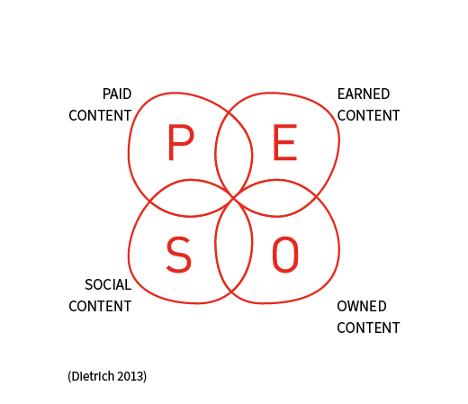The PESO model is a model for portfolio management of channels in communication campaigns. PESO stands for Paid, Earned, Shared and Owned Media. It was introduced in 2013 by Gini Dietrich (2013). The PESO model defines shared media beyond Paid, Earned, Shared, and Owned media. Thus, it also captures social content generated by stakeholders on social media. The integrated model promotes content and process coordination between channels in the four content types.