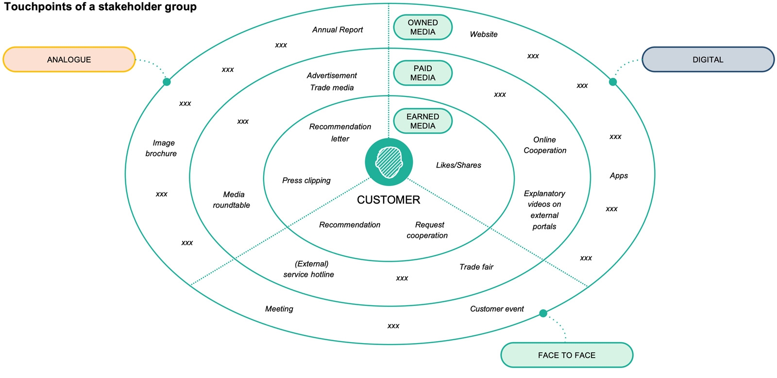 The touchpoint analysis – the sifting and breakdown of current and potential contact points – is based on the analyses of media usage behavior (cf. Tools 15 and 16) and on evaluations of feedback/media usage of the company's own communication measures in the past.