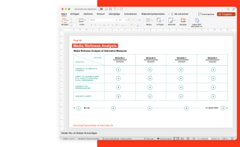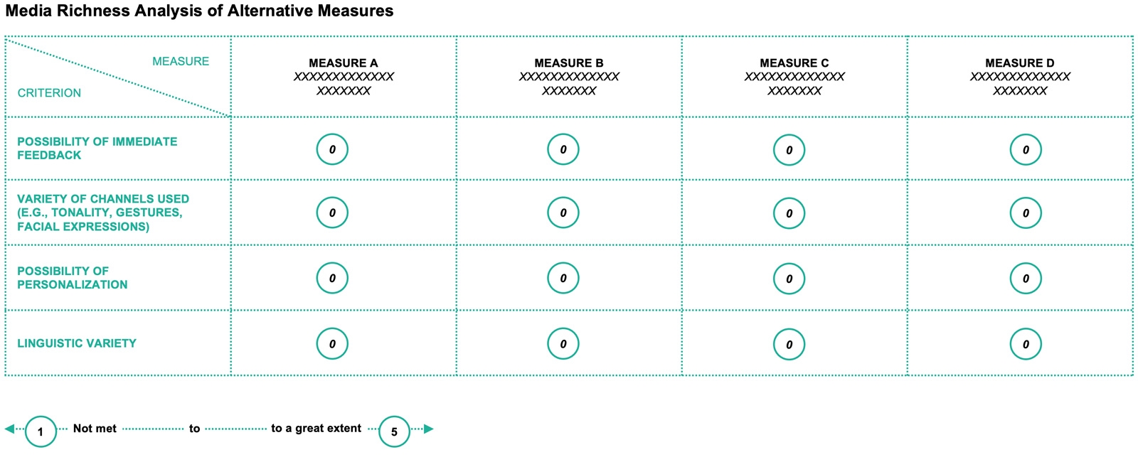 The tool assesses the media richness of media – and thus their potential to reduce communicative and social complexity in communication – by scoring on a scale of 1 to 5 across four criteria: