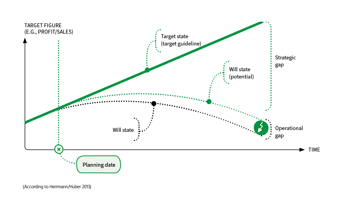 With the gap analysis, strategic and operational gaps between the target (TARGET) and the expected development can be identified. Different future projections (scenarios) are compared with each other.