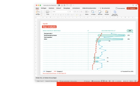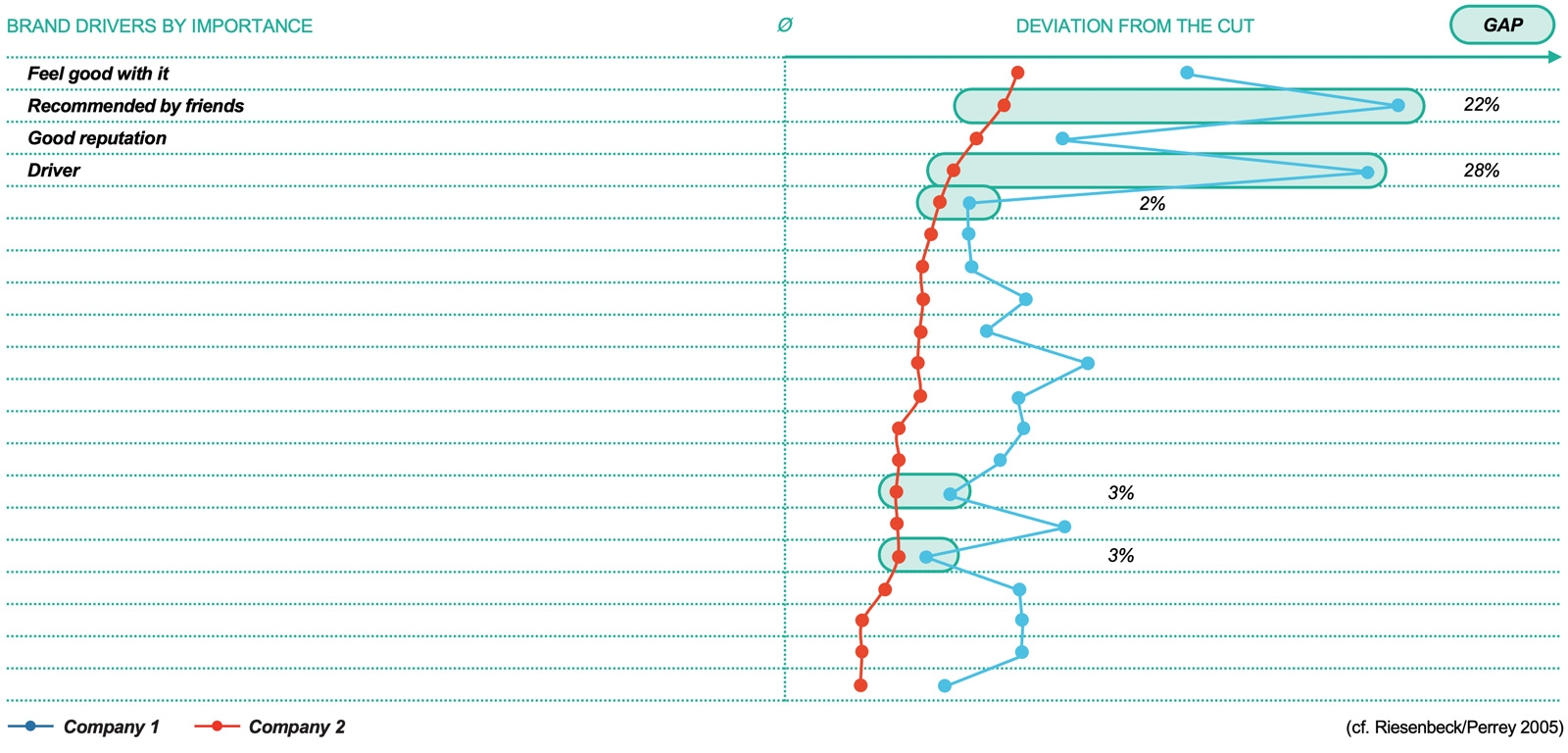 Most of the analysis tools presented here can also be used to define objectives, e.g., the Denison Cultural Survey (Tool 8), the Commitment Index (Tool 7) or the Image Survey (Tool 5). If both the ACTUAL and TARGET values are entered in such a tool, the target deviation (gap) between the current state and the target value, e.g., for topics or media use, can be seen at a glance. Alternatively, the deviations between the values of the own company compared to the competition are presented.