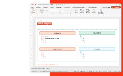 For the SWOT analysis, the previous analysis results must be summarized, typically in abbreviated sentences. The lists in the fields of the SWOT analysis do not have to be categorically clean, i.e., analysis results of all types stand directly next to each other.