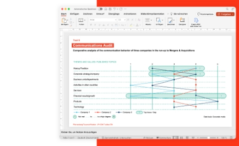 The Communications Audit is a qualitative survey of companies' communications behavior. The subject of the audit can be the communications behavior of one company or - as part of a comparative analysis in preparation for M&A, for example - of several companies. In the latter case in particular, the communications audit is often combined with cultural due diligence (see Tool 8). Implementation will take the form of guided interviews with internal and/or external stakeholders of the company/companies.