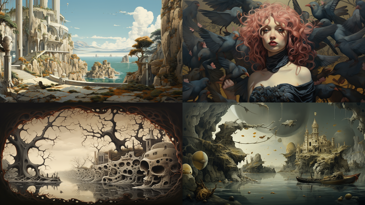 Prompt: Die Headline des Blogposts lautet „Workshop Redigieren: Ars Longa Vita Brevis”. Um zu sehen, wie Midjourney die Headline interpretiert, prompten wir: „Ars Longa Vita Brevis --ar 16:9 --c 0". Ergebnis: Midjourney lieferte 4 Bildideen, die mit Todessymbolen (Raben, Totenköpfe, Wasser) und Darstellungen des Lebens (Frau) arbeiten. In diesen Bildern fehlt die Darstellung des Schreibens/Redigierens.