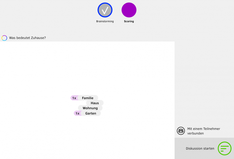 - Scoring: Die Teilnehmer bewerten diese Antworten und/oder vom Moderator festgelegte. Somit können zum Beispiel Ideen eines Kunden (ganz anonym) bewertet werden.