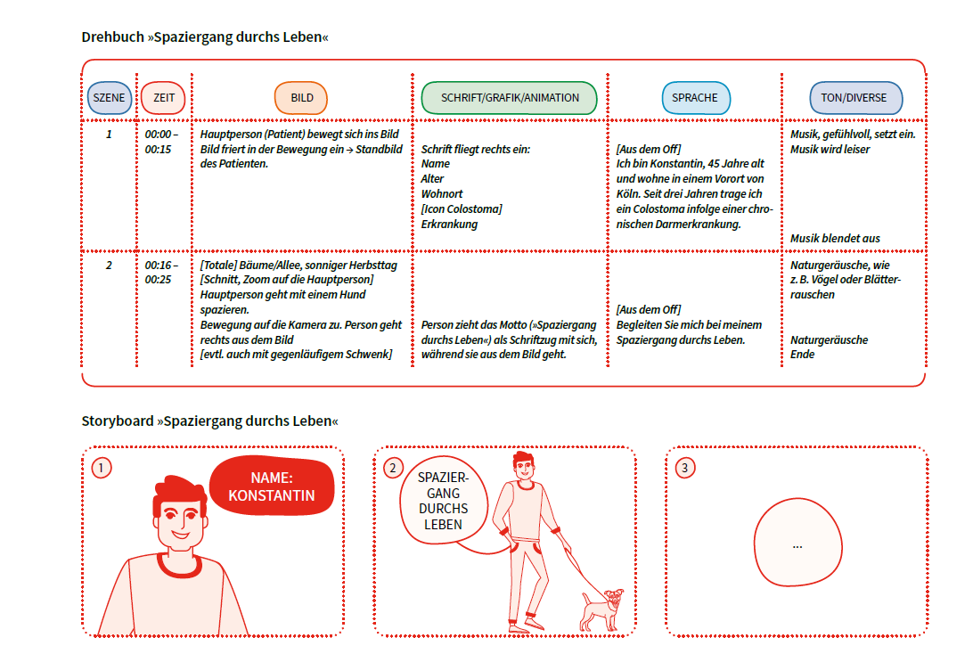 Wie kann Bewegtbild die Botschaft anschaulich und emotional transportieren? Das Drehbuch und ggf. zusätzlich ein Storyboard ist die Basis für die Entwicklung von Stories in Videos und die Vorbereitung des Drehs: Hier wird die Abfolge der Szenen festgelegt, die wesentlichen Einstellungen mit Schwenks und Schnitten jeder Szene mit ungefährer Dauer (Timecode), Text aus dem Off und durch die Figuren, Geräusche, Musik und ggf. Schrifteinblendungen.