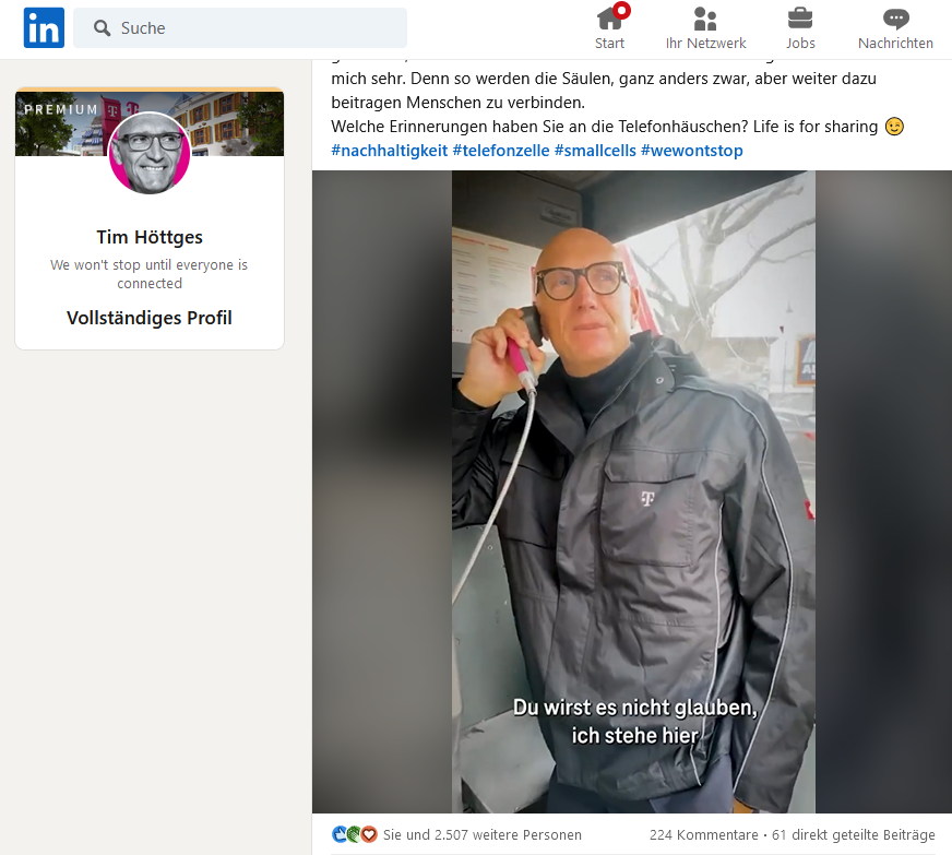 Unser PR-Tipp: Bauen Sie Videos in die CEO-Kommunikation ein! Umfragen zeigen: Von CEOs wird erwartet, dass sie sich zu gesellschaftskritischen Themen äußern (Edelman Trust Barometer 2023). Das ist relevant für das Vertrauen in die Firma und in die Wirtschaft allgemein. CEOs können in Videos Stellung beziehen und den Werten des Unternehmens ein glaubwürdiges Gesicht geben. Der Champion unter den Corporate Influencern in Deutschland, Tim Höttges von der Telekom, zeigt auch Humor: Mit dem letzten Anruf aus einer Telefonzelle signalisiert er die Fortschritte in der Vernetzung.