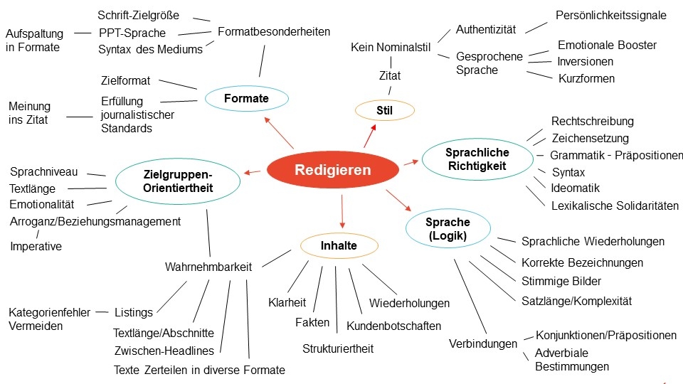Früher wurde nur handschriftlich auf dem Blatt redigiert, heute meist digital im Korrekturmodus. Für die Übersichtlichkeit und in Ausbildungsverhältnissen kommt die traditionelle Papierredaktion immer noch zum Einsatz. Das Mindmap gibt einen Überblick, worauf PR-Redakteur:innen achten sollten.